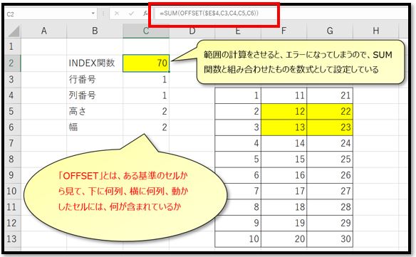 OFFSET関数というのは、フレキシブルに行と列を動かしつつ、かつ、高さや幅を調整することができる